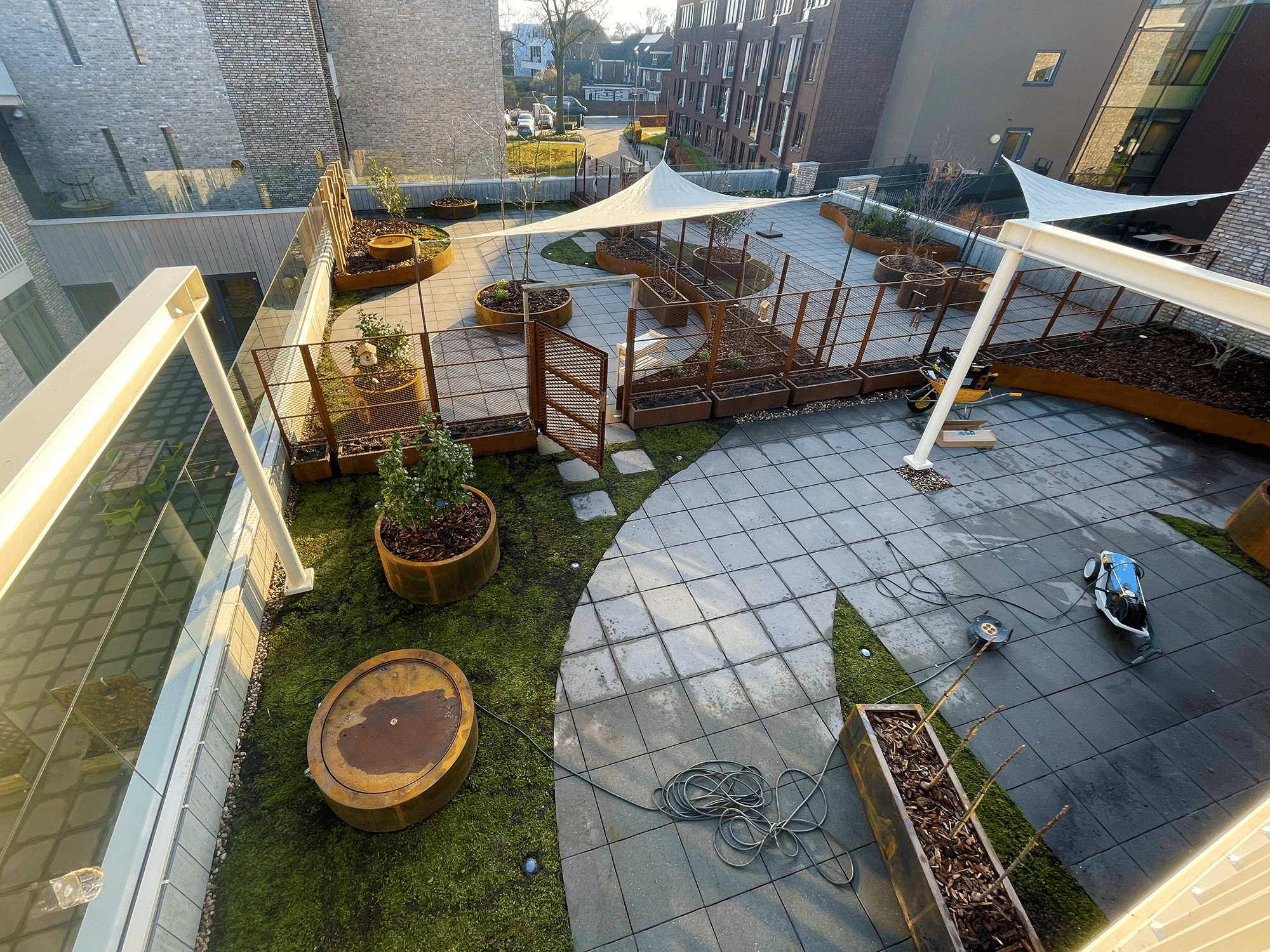 Met behulp van een grote torenkraan zijn zeven op maat gemaakte cortenstalen borders en een veertigtal bloembakken op het dak gehesen. Deze elementen zijn speciaal ontworpen voor de beschikbare ruimte en dragen bij aan een krachtige, warme uitstraling. De bakken en borders zijn afgevuld met speciaal ontwikkelde daksubstraten die zorgen voor optimale waterbuffering, gewichtsbeheersing en voedingsbalans.